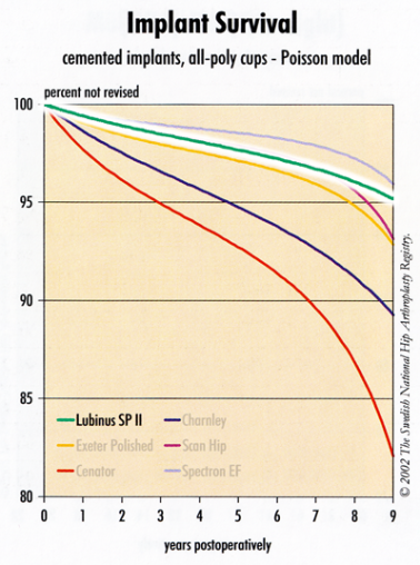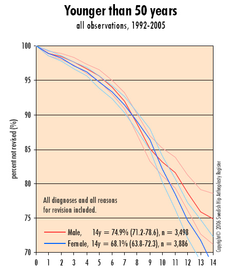 Die Standzeiten der Hüftendoprothesen sind bei jüngeren Patienten durchschnittlich kürzer als bei älteren Patienten. Junge Patienten sind insgesamt aktiver und fordern das Implantat stärker als ältere Patienten. Somit kann es schneller zu Implantatlockerungen kommen.